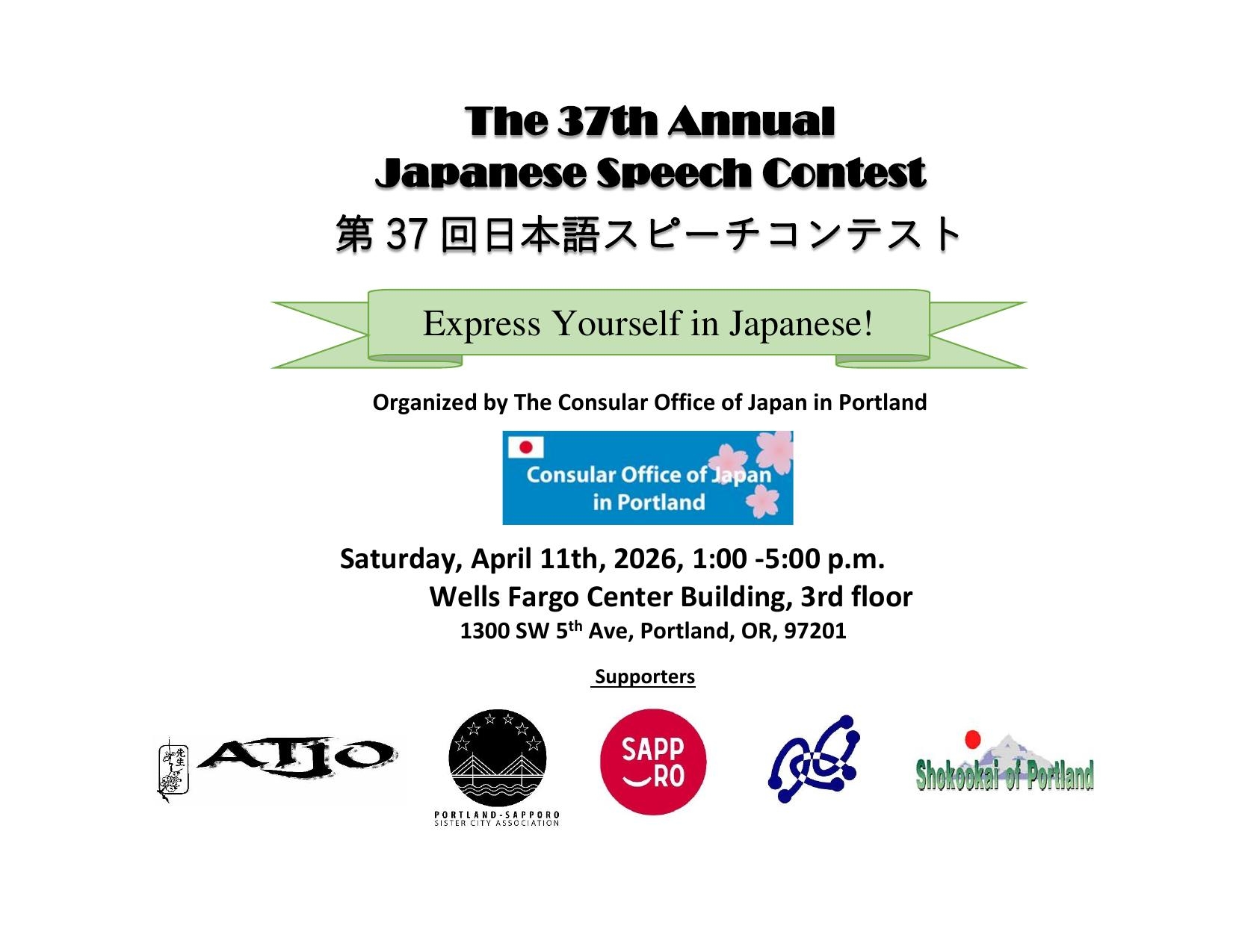 The Consular Office of Japan in Portland is pleased to announce our 37th Annual Japanese Speech Contest, which will be held in the Hawthorne Room of the Wells Fargo Center Building from 1:00 – 5:00 pm on Saturday, April 11th, 2026.